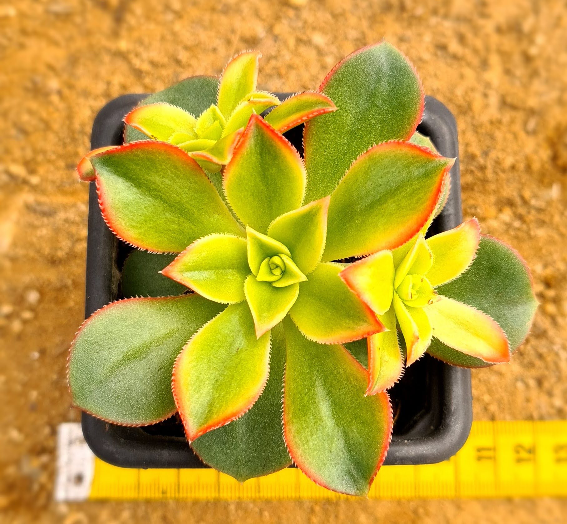 Aeonium 'Kiwi' é uma cultivar compacta mas arbustiva, com folhas verde-amareladas com bordas vermelhas. Pode ser cultivada em um local bastante iluminado. O solo deve ser drenável.
