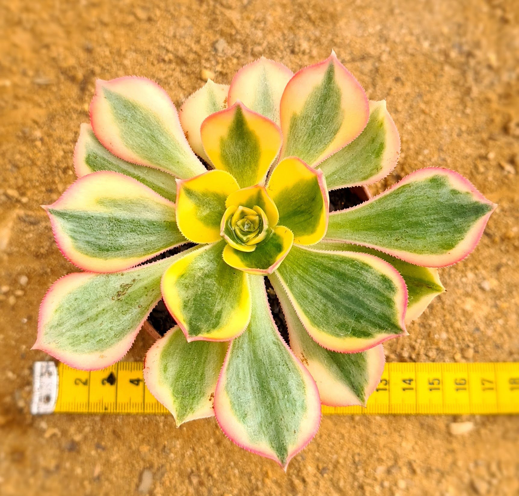Provavelmente originária das Ilhas Canárias, e em forma variegata, planta que pode chegar a 50 cm de altura, formada por rosetas planas, de 10 a 30 cm de diâmetro, folhas laminares glabra verde com bordas rosa e amarelada. Planta fácil de ser cultivada em lugares bem iluminados, em substrato drenável, bem adubado e com regas regulares.
