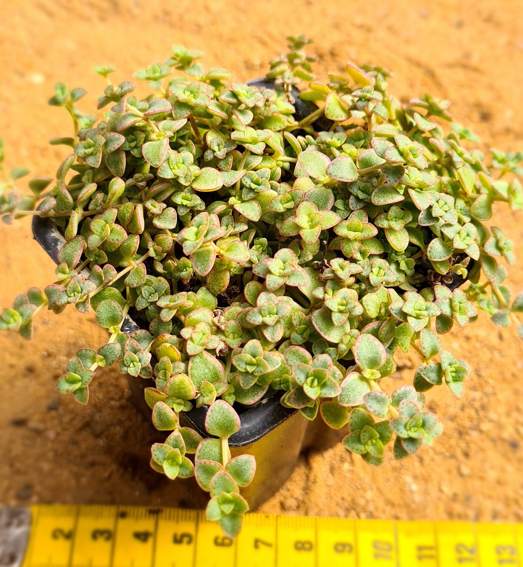 Ramos glabros, avermelhados e prostrados. Folhas suculentas, de cor verde com as bordas avermelhadas, largamente ovadas e com ápice pontiagudo possui uma borda branca. Inflorescência é um ramo múltiplo arredondado com muitas flores. Flores pequenas, brancas tingidas de rosa, em forma de estrela. Surgem no outono ou no final do verão. Planta de fácil manejo e ótima para cobertura de pequenas áreas. Pode ser cultivada em sol pleno ou meia sombra em substratos drenável e bem adubado e com regas regulares.