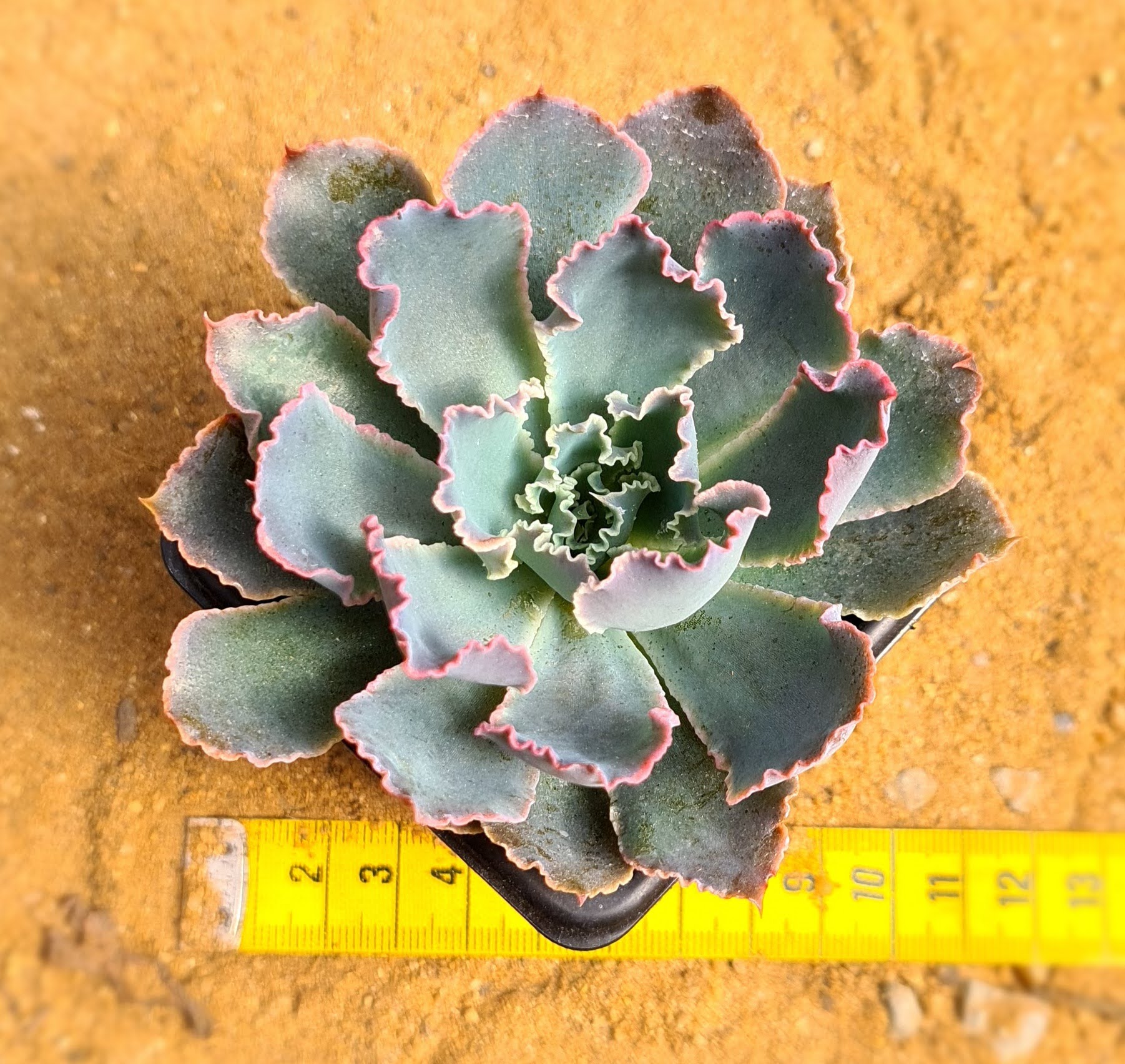 Planta de fácil cultivo tem forma de roseta caracterizada por folhas com margens finamente pregueadas e uma fina camada de pruina em sua superfície. A cor da folhagem é rosa brilhante ou vermelho-púrpura em pleno sol, com alguma diferença de temperatura. Prefere um ambiente ensolarado, bem ventilado, com substrato poroso, bem adubado, regas moderadas e boa incidência solar.